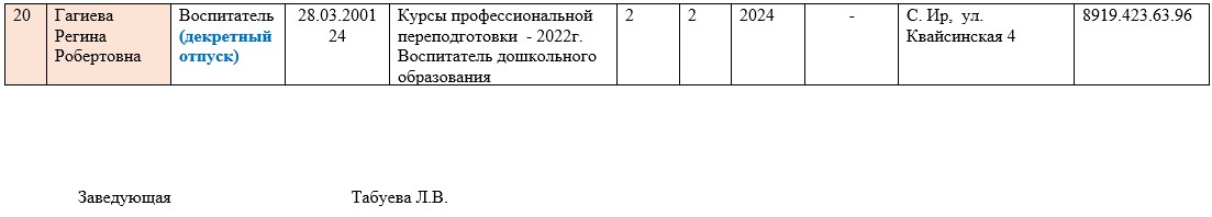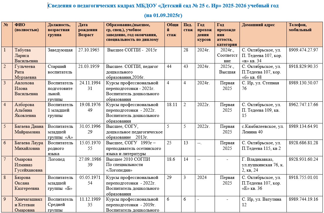 Сведения о педагогических кадрах МБДОУ «Детский сад №25 с. Ир» 2024-2025 учебный год.